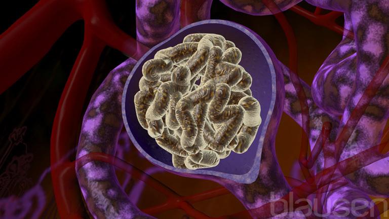 신장의 기능에는 체액 함량 균형 조절, 혈압과 적혈구 생성 조절, 신체에서 노폐물 여과 등이 있습니다. 각 신장은 약 백만 개의 콩팥단위라는 여과 단위로 구성되어 있습니다. 각 콩팥단위는 사구체라는 뭉쳐진 모세 혈관 다발을 포함합니다. 반투과성 사구체가 물과 가용성 노폐물이 혈액으로부터 막을 통과할 수 있게 해줍니다. 그 후 여과된 노폐물은 소변의 형태로 신체 밖으로 운반됩니다.