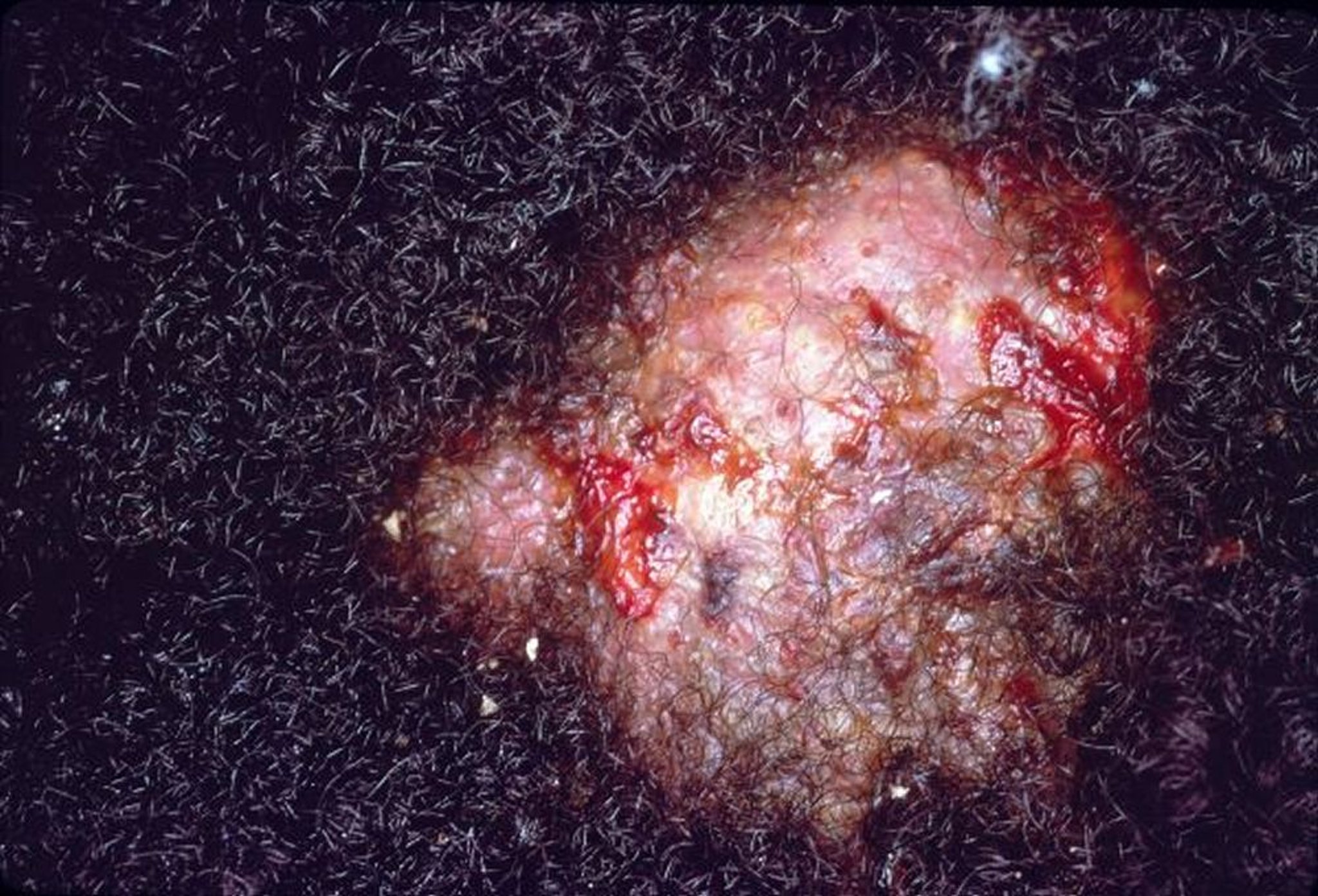 Dieses Foto zeigt ein Kerion, eine große, weiche Kopfhautmasse, die durch eine schwere Entzündungsreaktion auf eine Dermatophyteninfektion der Kopfhaut verursacht wird. Pusteln und Verkrustungen sind sichtbar.