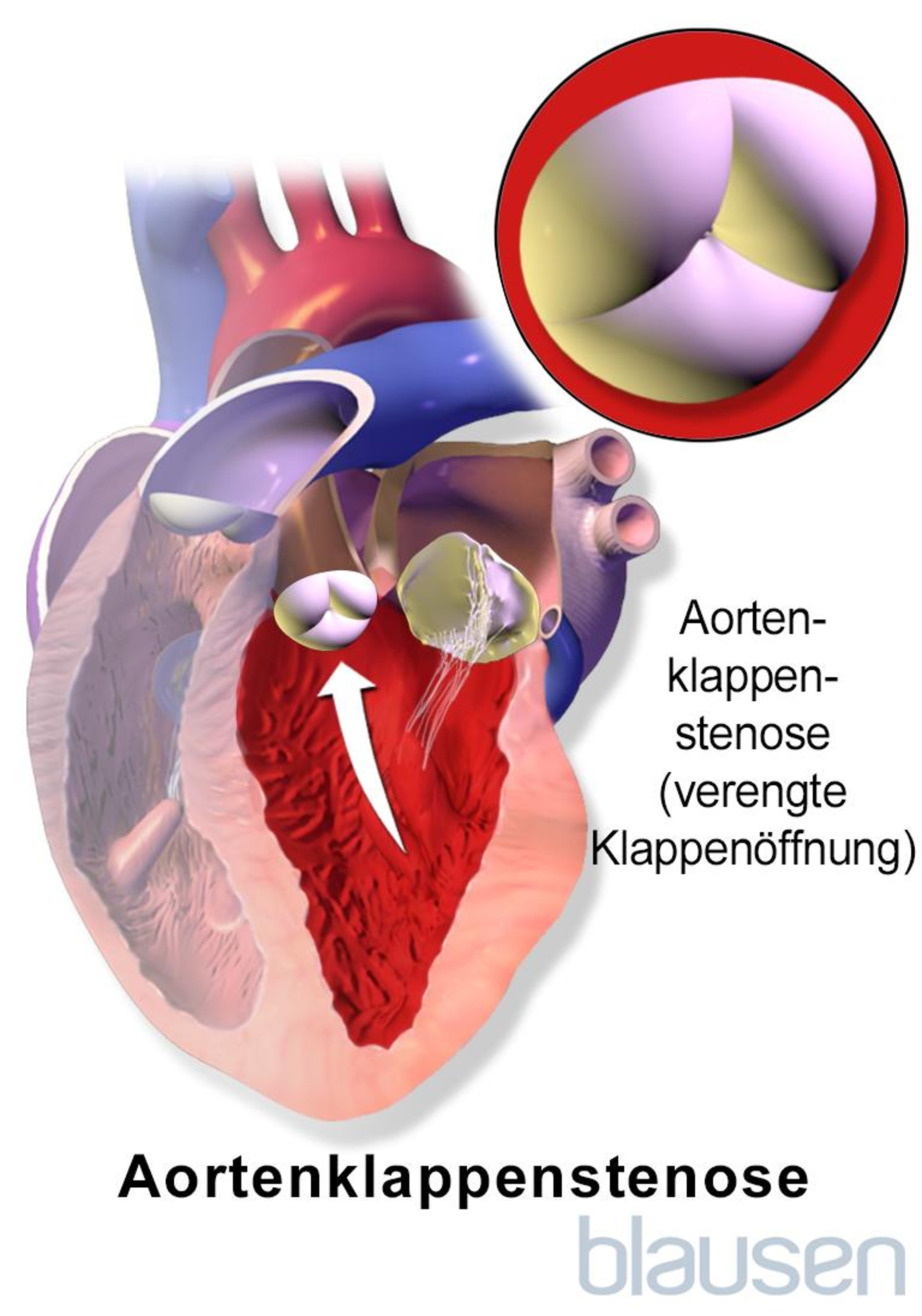 • Schwere Klappenverkalkung mit raschem Fortschreiten der Stenose (Verringerung der Aortenklappenfläche ≥ 0,3 m/Sekunde/Jahr)