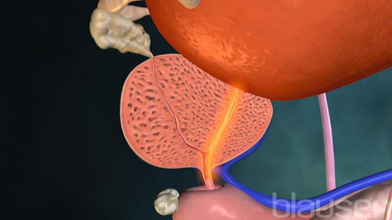 The prostate is a small, round gland of the male reproductive system that is located in front of the rectum, at the base of the bladder. Its primary function is to release fluid into the urethra during ejaculation. During ejaculation, sperm travels from the testicle up and back into the body through a tube called the vas deferens. The vas deferens run behind the bladder and enter into the prostate gland. As it travels through the male reproductive system, sperm combines with seminal fluid, another component of ejaculate, from three sources - the seminal vesicles, the prostate, and the bulbourethral glands. The ejaculate then travels the length of the urethra and out of the body via the penis. Normally, the prostate gland grows as a man matures. The enlargement is referred to as benign prostatic hyperplasia, or BPH, and doesn't usually cause any problems until late in life. A common symptom of BPH is a noticeable change in urination resulting from obstruction of the urethra and the loss of bladder function. Left untreated, BPH can lead to urinary tract infections, bladder or kidney damage, bladder stones, or incontinence. A doctor can recommend appropriate treatment depending on the severity of symptoms.