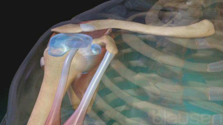 Two sac-like structures called bursae are also located in the shoulder. The bursae secrete a lubricating fluid, which helps reduce friction between the moving parts of the joint.