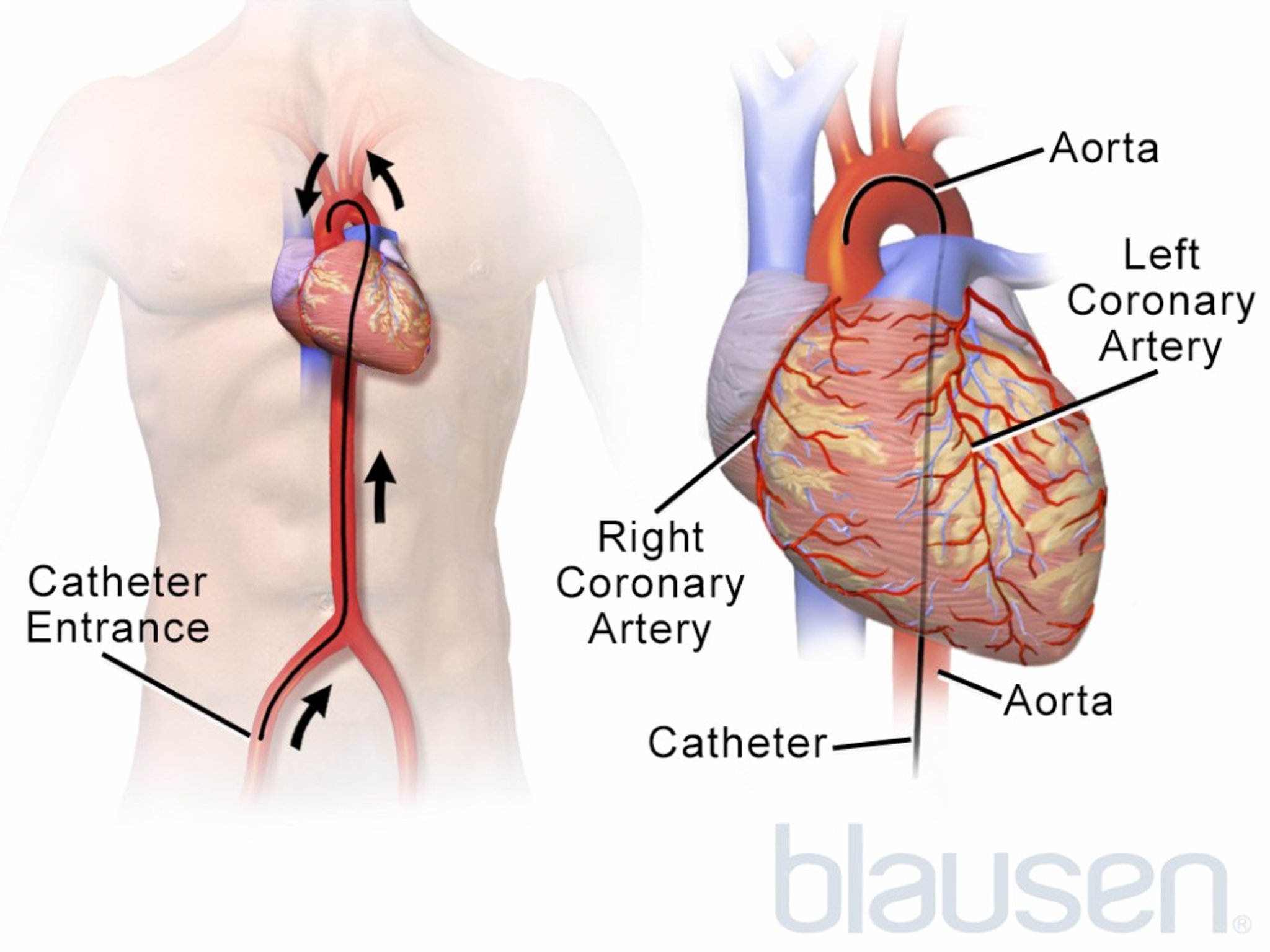 Untuk kateterisasi sisi kiri jantung, kateter ini dimasukkan ke dalam arteri, biasanya di lengan (di dekat siku atau pergelangan tangan), leher, atau selangkangan, dan didorong dari arteri menuju aorta, arteri besar yang membawa darah dari jantung.