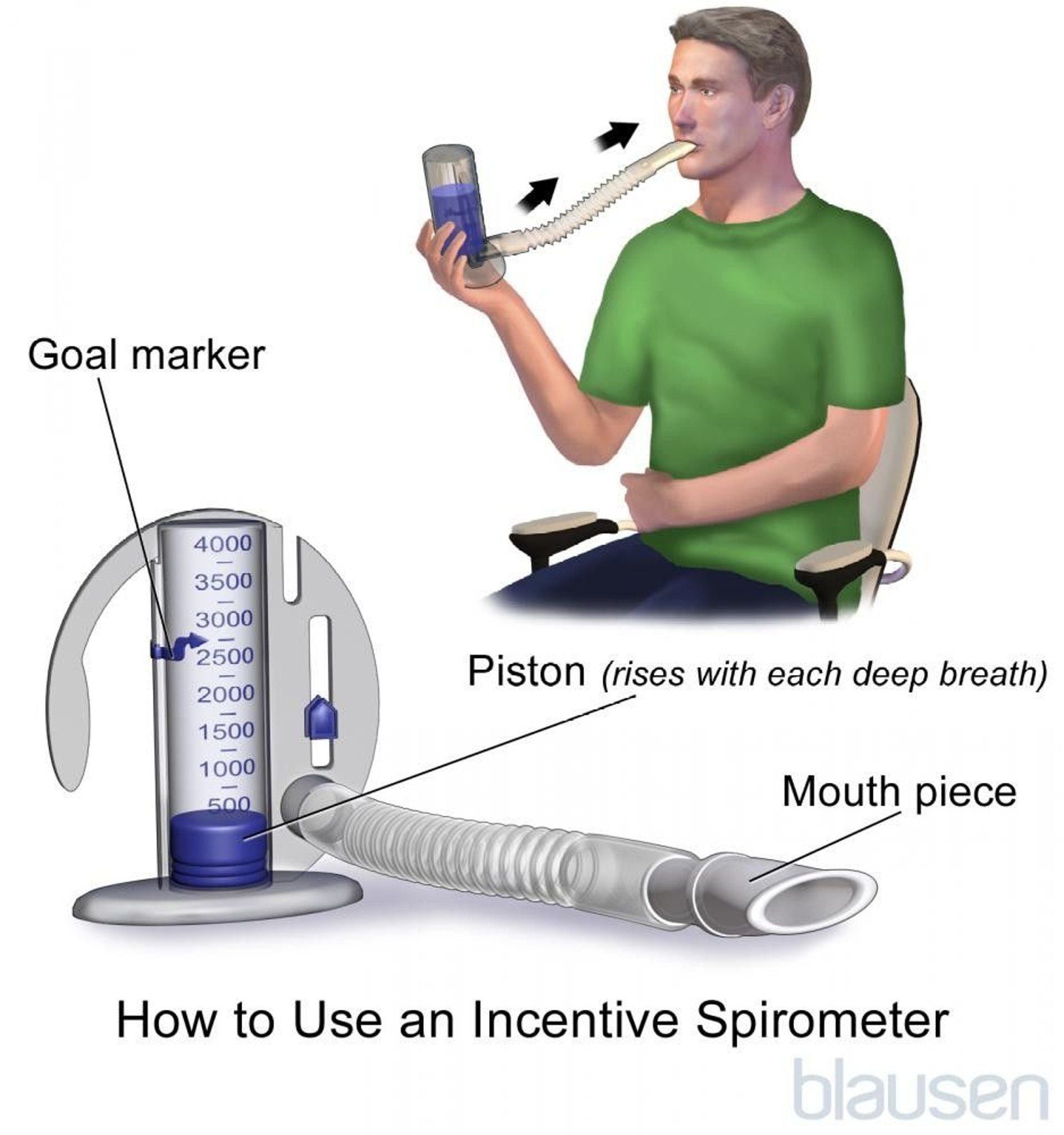 Sering kali, latihan ini melibatkan penggunaan instrumen yang disebut spirometer insentif. Seseorang menarik napas sedalam mungkin melalui tabung yang terhubung ke ruang plastik genggam. Ruang berisi bola, dan setiap napas akan mengangkat bola. Idealnya, manuver ini dilakukan 5 hingga 10 kali berturut-turut setiap jam saat orang tersebut terjaga. Perangkat ini digunakan secara rutin di rumah sakit sebelum dan setelah pembedahan. Namun demikian, latihan pernapasan dalam yang dianjurkan oleh perawat dan terapis pernapasan mungkin lebih efektif daripada latihan pernapasan mandiri menggunakan spirometer insentif.
