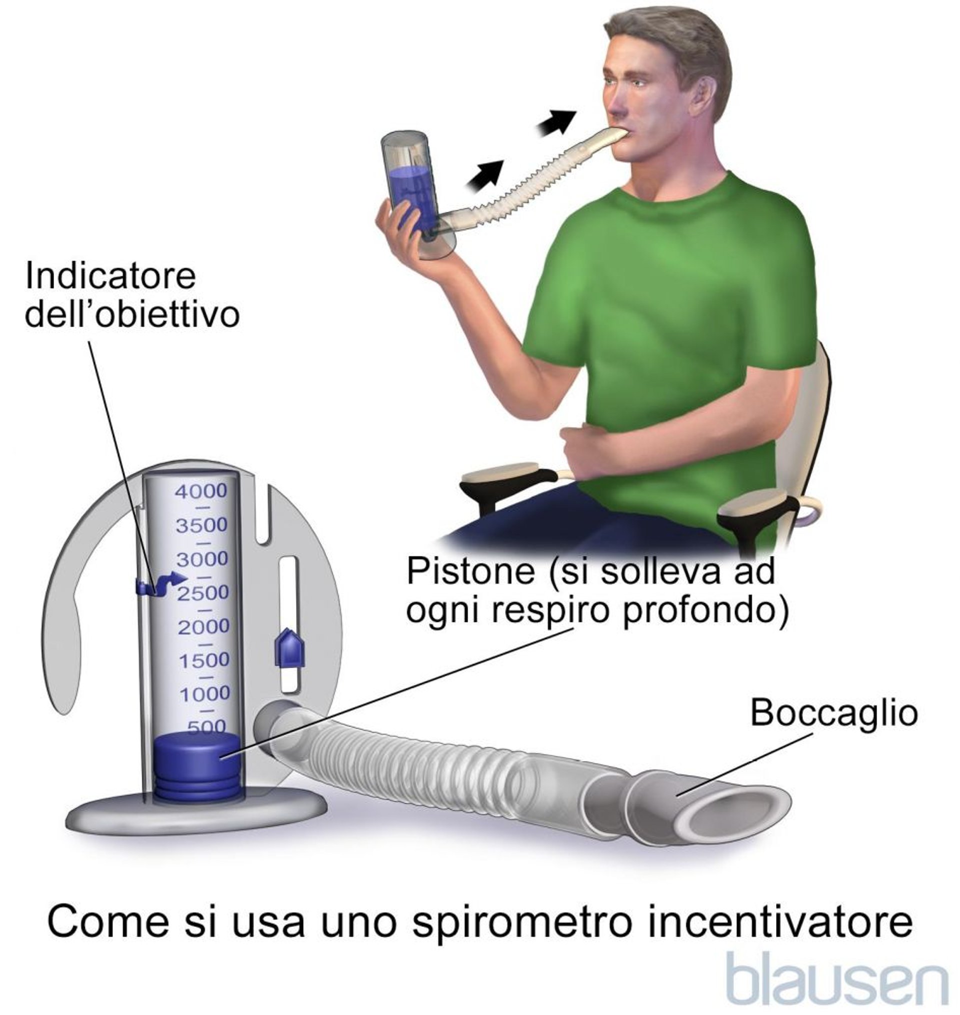 Spesso questi esercizi prevedono l’impiego di uno strumento denominato spirometro incentivatore. Il paziente respira quanto più possibile in un tubo, collegato a una camera di plastica portatile. La camera contiene una pallina che viene sollevata con ogni respiro. Idealmente, questa manovra deve essere eseguita ogni ora per 5-10 volte consecutive quando il soggetto è sveglio. Tale dispositivo viene comunemente impiegato nelle strutture ospedaliere prima e dopo un intervento chirurgico. Tuttavia, gli esercizi di respirazione stimolati dai terapisti della respirazione e dagli infermieri sono generalmente più efficaci, rispetto a quelli controllati dal paziente che prevedono l’impiego di uno spirometro incentivatore.