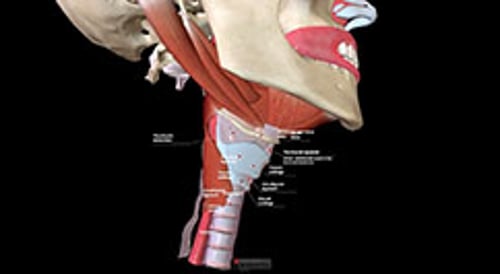 Questa scansione RM coronale mostra un laringocele misto che inizia all'interno della laringe e si estende attraverso la membrana tiroioidea, causando una massa nel collo.