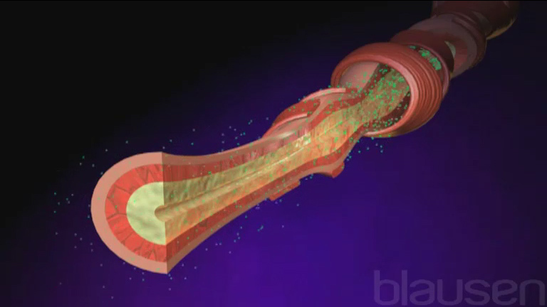 これらの反応が重なると気道が突然狭くなり、喘息発作が起こります。たいていの場合、喘息の発作と発作の間の期間は、気道は正常に戻ります。この刺激が繰り返し起こると気道内で粘液がたくさん作られるようになって、気道の内側の細胞が剥がれ、気道の壁の中にある筋細胞が大きくなります。