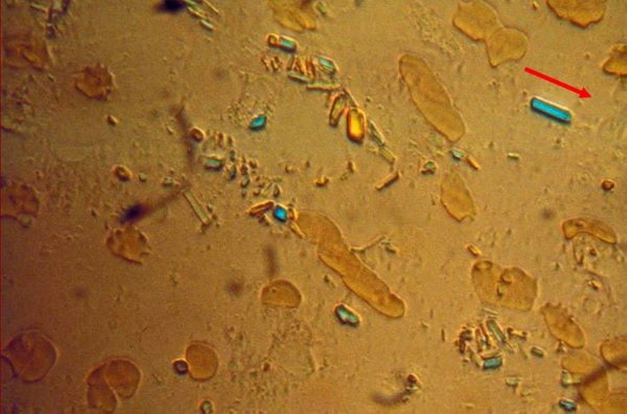 滑液に複屈折性を示さないまたは弱い正の複屈折性の特徴的な菱形または桿状の結晶がないか調べ,関節の感染症を除外する。
