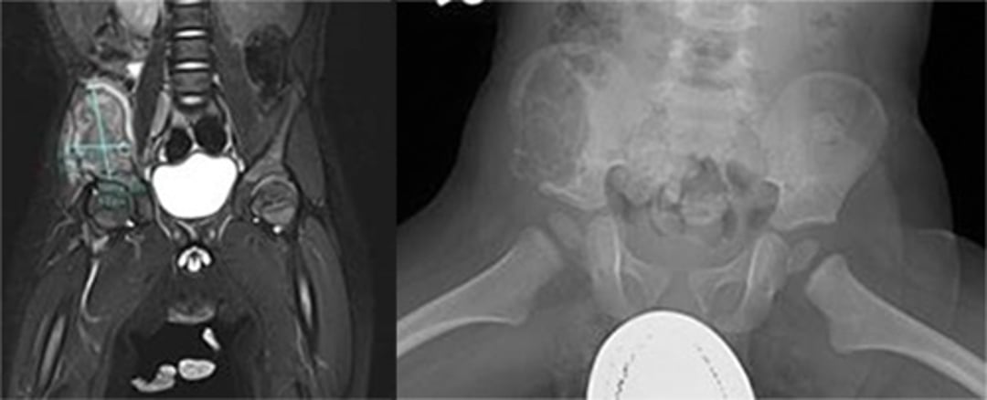 症状があるため,X線検査を実施することが多い。通常の骨病変は,境界が明瞭な円形または楕円形で,端部が傾斜して奥行きがあるように見える。ただし,X線像では,ユーイング肉腫,骨肉腫,その他の良性および悪性疾患,または骨髄炎と区別できない病変もある。