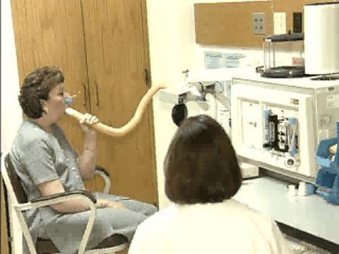 폐활량측정법은 폐기능 검사에 사용합니다. 환자가 정상적으로 호흡한 후 관에 부착된 마우스피스를 통해 숨을 깊고 빠르게 들이마십니다. 이어서 폐를 최대한도로 비울 때까지 숨을 빠르게 내쉽니다. 이 호흡은 완전히 호흡할 때마다 오르락 내리락 하는 검정 플라스틱 부착물이 달린 폐활량계(우측)를 사용하여 측정합니다. 많은 폐활량계들은 전자식이고, 호흡할 때마다 움직이는 피스톤 또는 주름통이 없습니다.