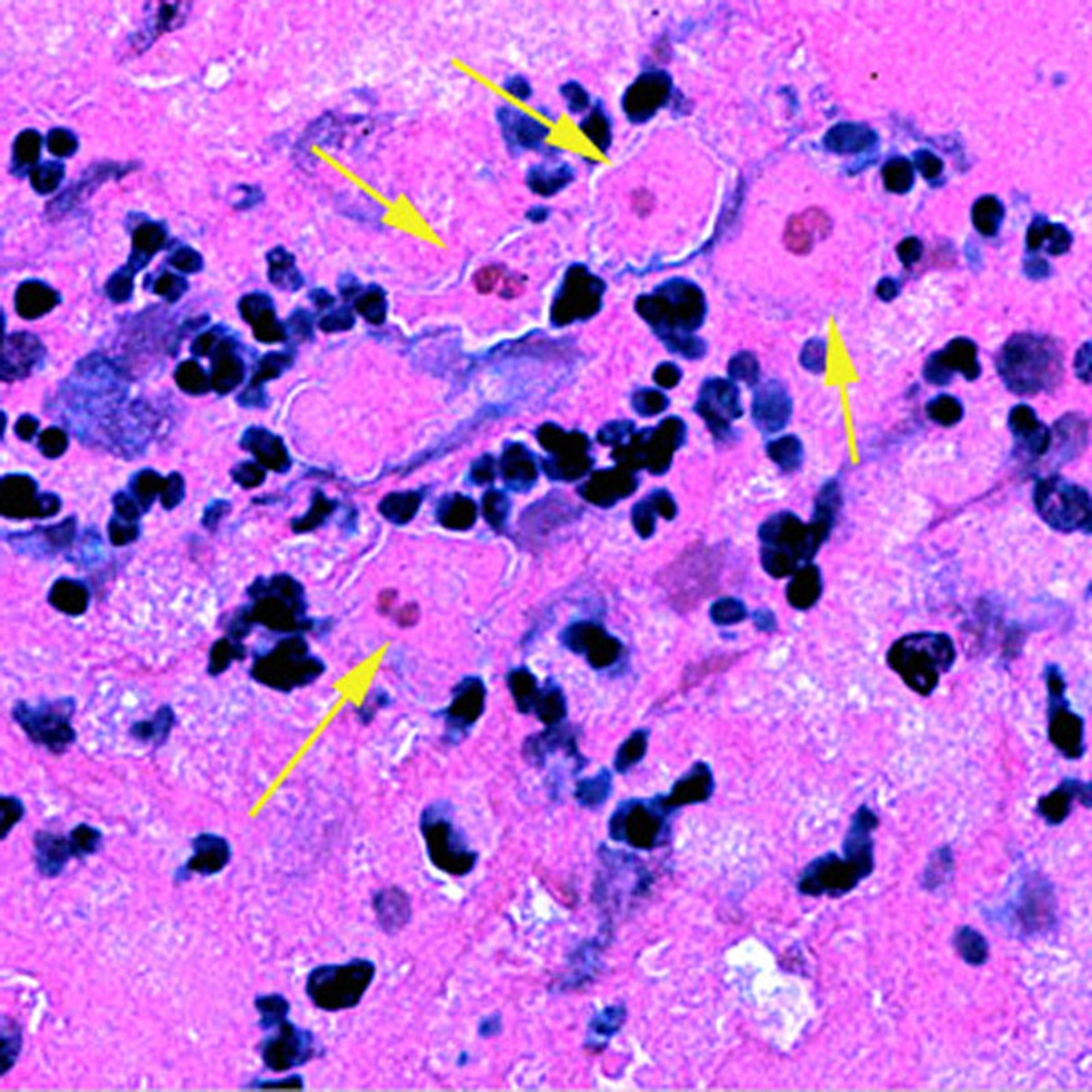 In patients with S. pedata infections of the brain, biopsy of the brain lesion can provide critical diagnostic information. The presence of necrotizing hemorrhagic inflammation with free-living amebas, particularly those with distinctive double nuclei, is indicative of Sappinia infection.